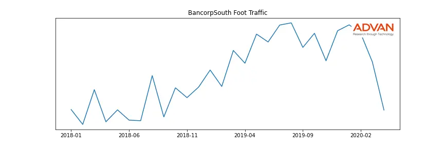 Advan Research collects and manually verifies all the individual BancorpSouth locations worldwide, on a point-in-time basis. These detailed locations, also called Points Of Interest or POIs, are then used by Advan to compute how many mobile phones have visited the locations. Advan computes cellphone traffic using a dataset of more than 320 million cellphones observed with a second-level time accuracy and 10 meter location accuracy, since 2015. The graph below shows the visits aggregated across all 344 of the locations of BancorpSouth: