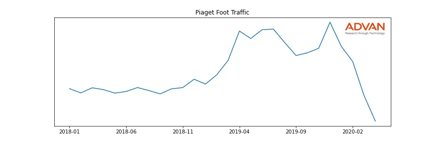 Advan Research collects and manually verifies all the individual Piaget locations worldwide, on a point-in-time basis. These detailed locations, also called Points Of Interest or POIs, are then used by Advan to compute how many mobile phones have visited the locations. Advan computes cellphone traffic using a dataset of more than 320 million cellphones observed with a second-level time accuracy and 10 meter location accuracy, since 2015. The graph below shows the visits aggregated across all 8 of the locations of Piaget: