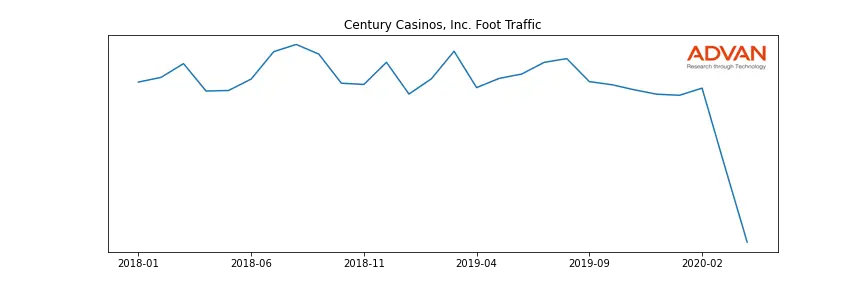 Advan Research collects and manually verifies all the individual Century Casinos, Inc. locations worldwide, on a point-in-time basis. These detailed locations, also called Points Of Interest or POIs, are then used by Advan to compute how many mobile phones have visited the locations. Advan computes cellphone traffic using a dataset of more than 320 million cellphones observed with a second-level time accuracy and 10 meter location accuracy, since 2015. The graph below shows the visits aggregated across all 5 of the locations of Century Casinos, Inc.: