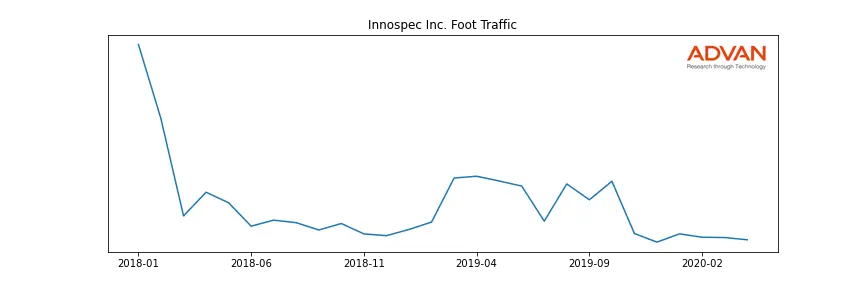 Advan Research collects and manually verifies all the individual Innospec Inc. locations worldwide, on a point-in-time basis. These detailed locations, also called Points Of Interest or POIs, are then used by Advan to compute how many mobile phones have visited the locations. Advan computes cellphone traffic using a dataset of more than 320 million cellphones observed with a second-level time accuracy and 10 meter location accuracy, since 2015. The graph below shows the visits aggregated across all 3 of the locations of Innospec Inc.: