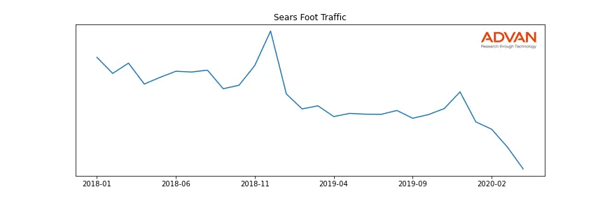 Advan Research collects and manually verifies all the individual Sears locations worldwide, on a point-in-time basis. These detailed locations, also called Points Of Interest or POIs, are then used by Advan to compute how many mobile phones have visited the locations. Advan computes cellphone traffic using a dataset of more than 320 million cellphones observed with a second-level time accuracy and 10 meter location accuracy, since 2015. The graph below shows the visits aggregated across all 2648 of the locations of Sears:
